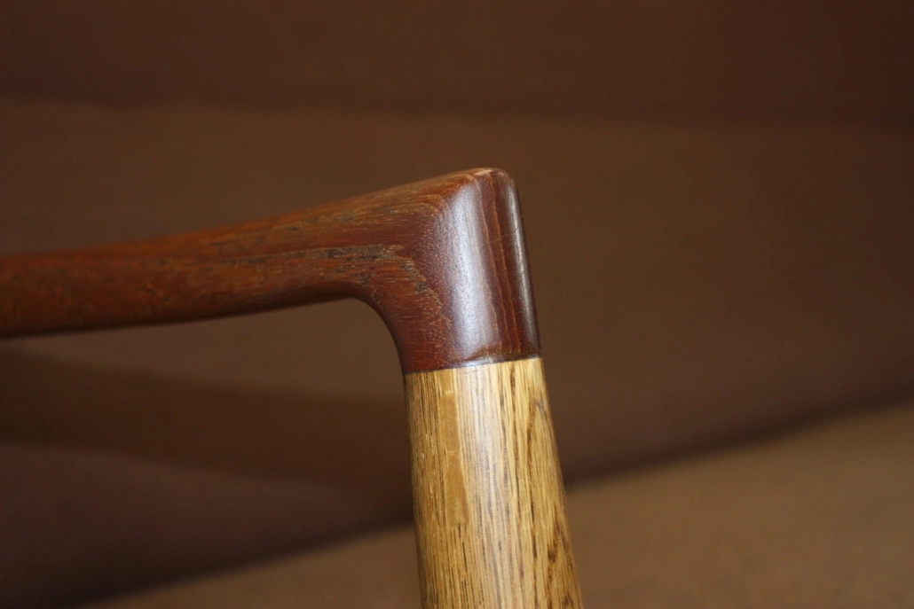 Kenmerkend voor de Bovenkamp-stijl, combineert de Mette bank een elegante, slanke vorm met een subtiele Scandinavische flair. Het frame en de poten zijn gemaakt van massief teakhout, met een verfijnde, licht naar buiten gebogen vorm die zorgt voor een luchtig, modern gevoel. De originele stof behoudt zijn natuurlijke, warme uitstraling en zorgt voor een comfortabele zitervaring, terwijl het strakke ontwerp bijdraagt aan de tijdloze elegantie van dit meubelstuk.