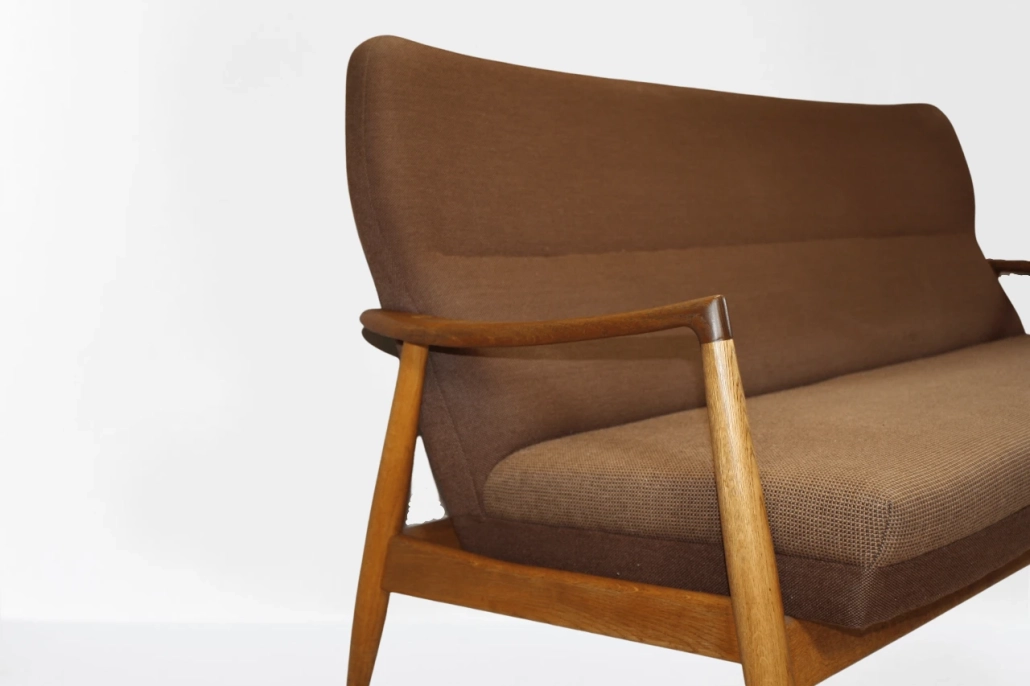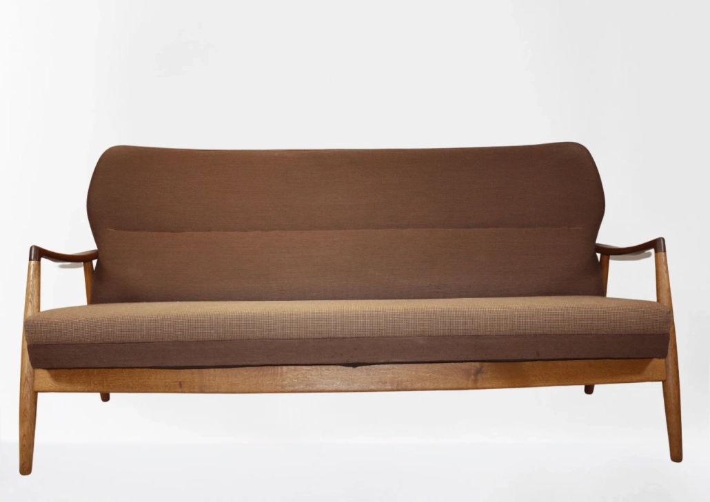 Deze prachtige vintage bank, ontworpen door de Deense ontwerpers Aksel Madsen en Henrik Schubell, werd in de jaren ’50 geproduceerd door het Nederlandse meubelmerk Bovenkamp. Dit tijdloze meubelstuk is nog steeds uitgevoerd in de originele, bruine stof en komt van de eerste eigenaar, wat getuigt van zijn authentieke charme en uitstekende kwaliteit.